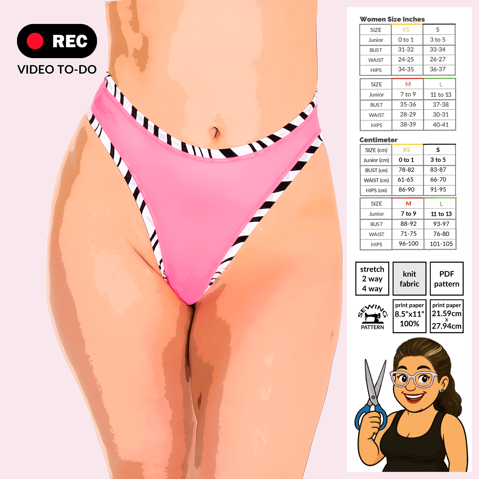 The banded construction allows for easy customization—use contrasting fabrics for sporty or stage-ready looks, or keep it sleek and minimal for daily wear. Designed for stretch fabrics, this thong can be sewn on a regular home sewing machine, with a serger recommended for best results.