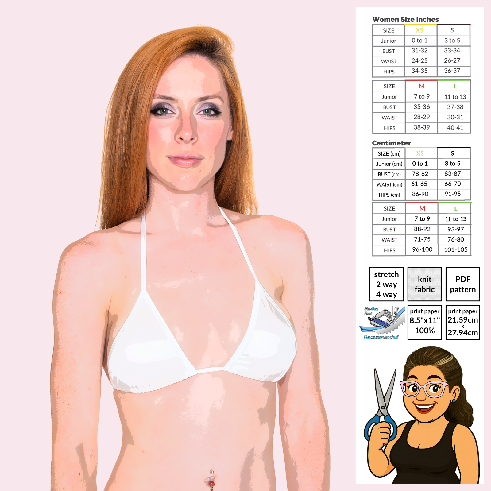 Binding edge triangle top sewing pattern designed for a minimal coverage fit with clean finished edges and adjustable string shaping. This triangle top uses stretch binding for a polished edge finish while allowing flexible fit and coverage through adjustable ties. Ideal for bikinis, rave wear, cosplay, and custom dancewear, this style runs slightly smaller than standard for a more revealing, customizable look without being fully micro.