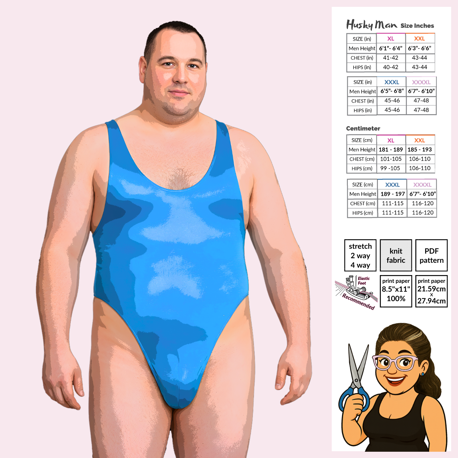 The Husky Men’s Racerback Bodysuit Sewing Pattern is designed to contour the torso and crotch while leaving the legs exposed, offering a sleek, performance-focused fit in extended sizes. This style features a thong back and athletic racerback silhouette, created for movement, comfort, and confidence.