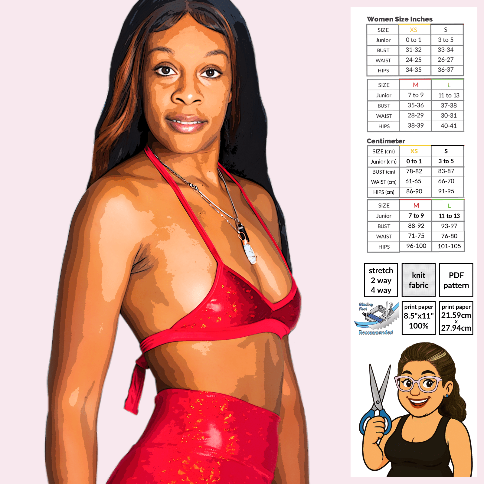 The Mini Sweetheart Top Sewing Pattern is designed for smaller busts and minimal coverage, making it perfect for swimwear, festivals, rave outfits, and bold DIY fashion. This micro-style top features adjustable tie neck and tie back straps so you can customize the fit while keeping the look sleek and sexy.