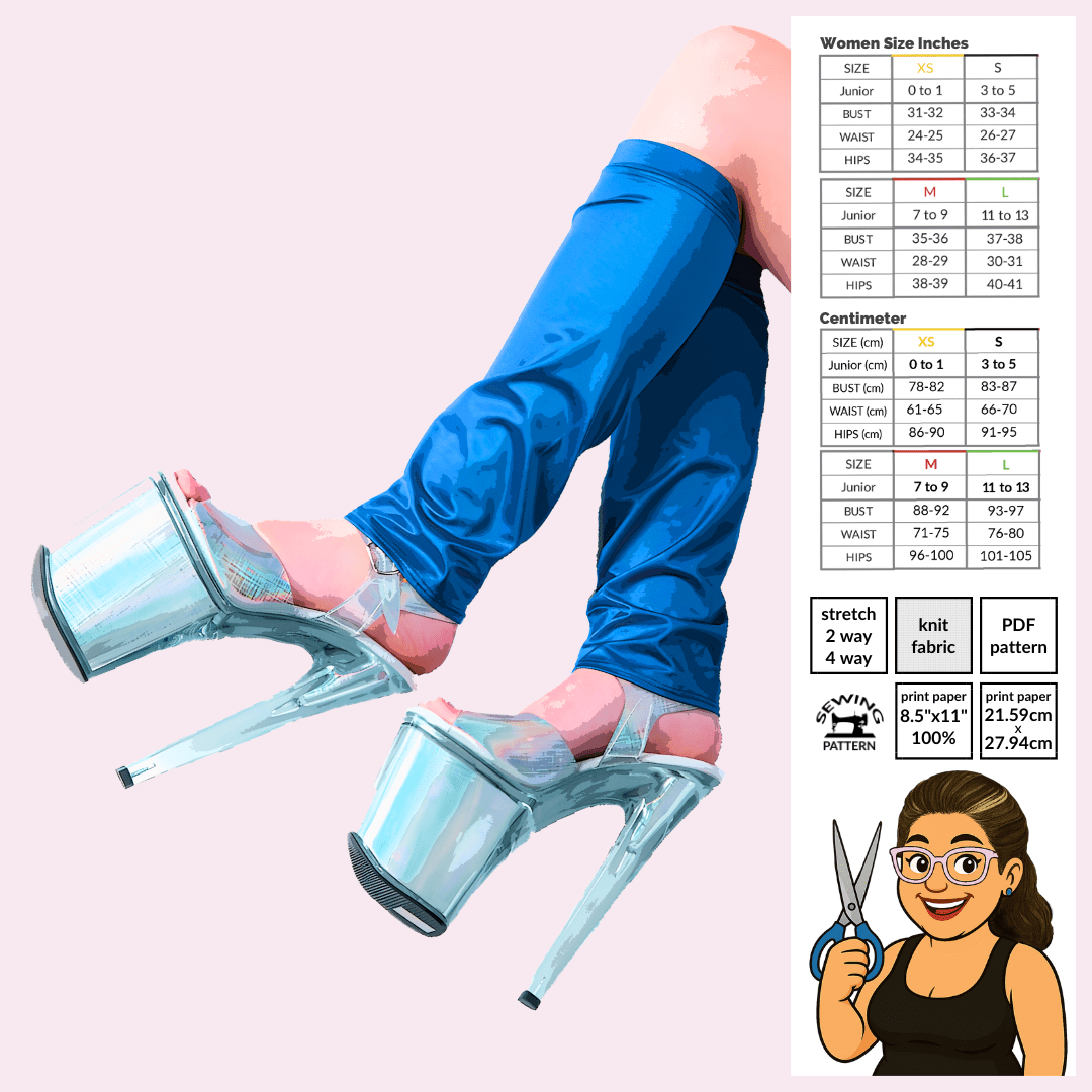 Sew sleek, under-the-knee leg warmers with this beginner-friendly PDF sewing pattern designed for stretch fabrics. This straight-leg style offers comfortable coverage that stays in place, making it perfect for rave outfits, pole wear, costume looks, and practical layering for cyclists who want extra warmth while riding.